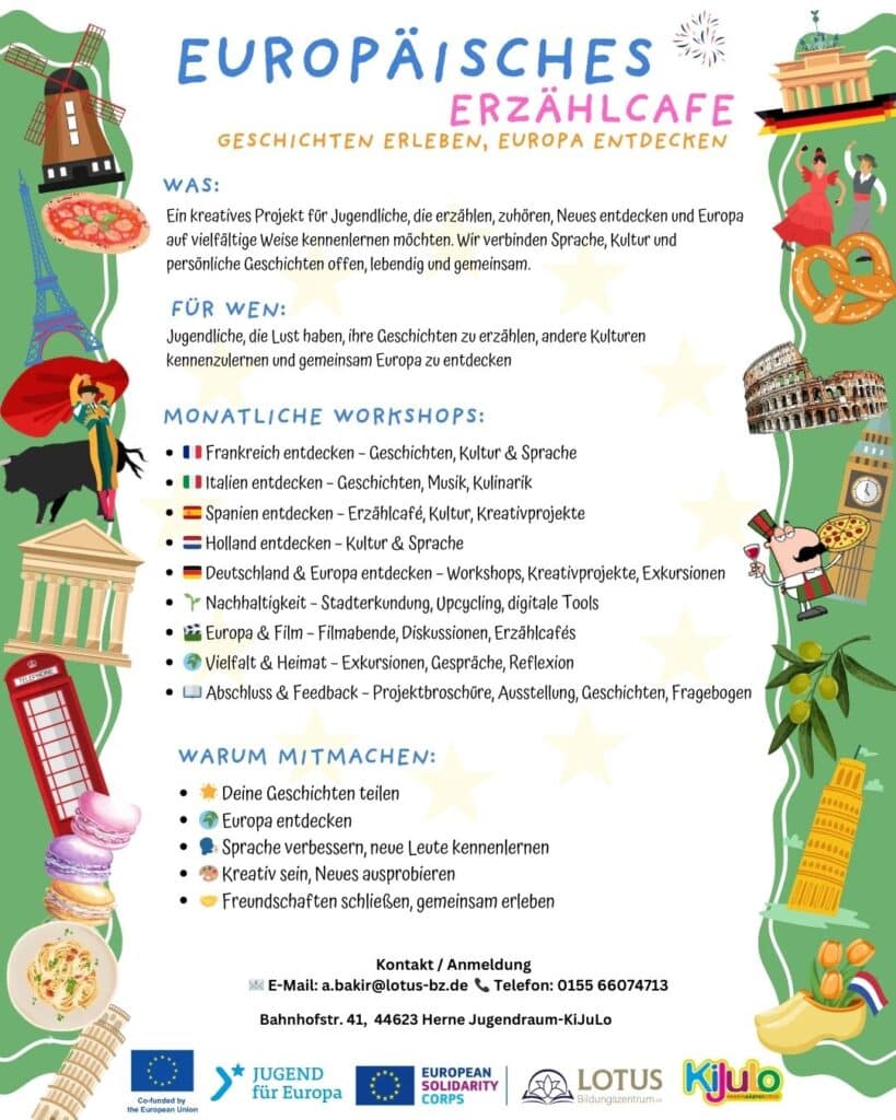 In regelmäßig stattfindenden Erzählcafés kommen junge Menschen aus verschiedenen kulturellen Hintergründen zusammen, um persönliche Geschichten, Erfahrungen und Perspektiven zu teilen. Die Teilnehmenden lernen europäische Kulturen kennen, reflektieren gesellschaftliche Themen und stärken ihre kommunikativen Fähigkeiten.